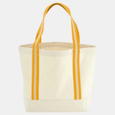 Contains 100% certified organic cotton. Premium, heavyweight fabric. Soft cotton, striped webbing handles. Can be carried by hand or over the shoulder.