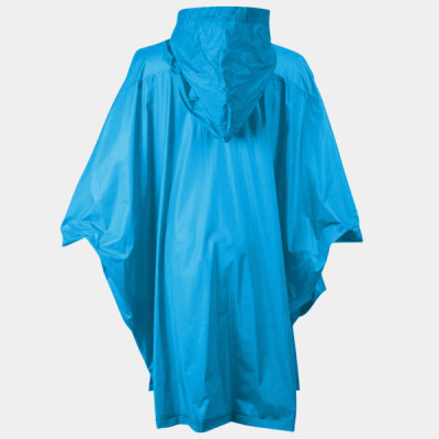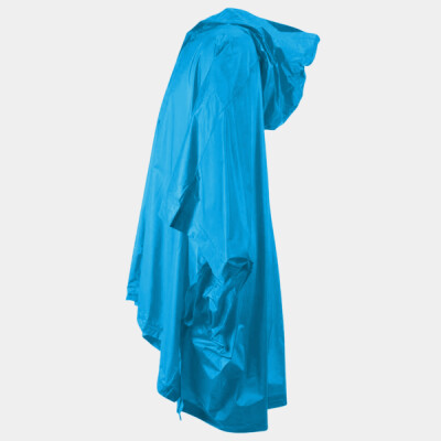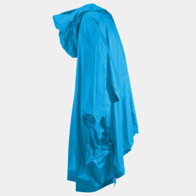 Kids Splashmacs poncho. Hood and popper neck fastenings with a double press-stud fastening on each side, allowing the wearer to open up the cape and lay it flat so it doubles as a useful groundsheet. Carry case, with drawstring handle. Printing Instructions: Can be decorated using screen printing inks, but always without direct heat.