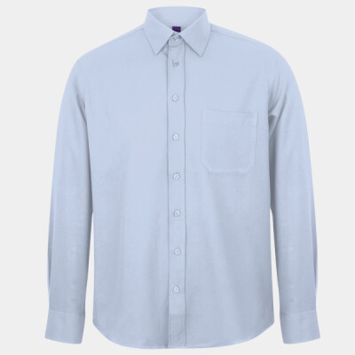 65% polyester/35% cotton. In transition to using recycled polyester. Easy iron fabric. Classic fit. Classic collar. Clear buttons. Left chest pocket. Two button cuffs. Curved hem.